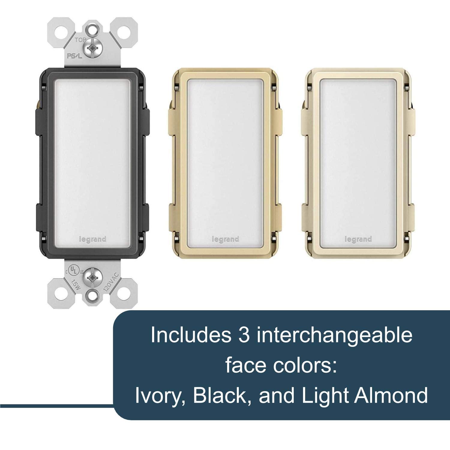 - Included - 1 Legrand - Pass & Seymour Radiant tamper-resistant in wall night light, tri color night light outlet, including black, light almond, and ivory colors