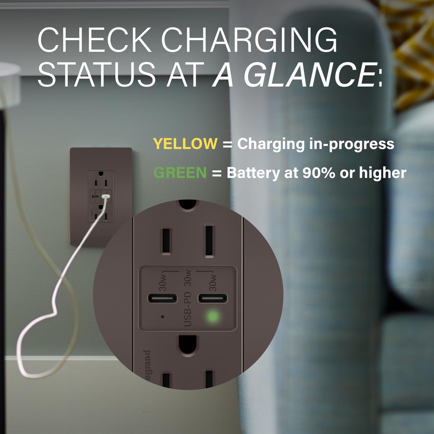 Legrand radiant R26USBPD 15 Amp Tamper-Resistant Decorator Duplex Receptacle Outlet with Ultra Fast USB C/C 6.0A Charging Ports PLUS 30W Power Delivery, Brown (1 Count)—